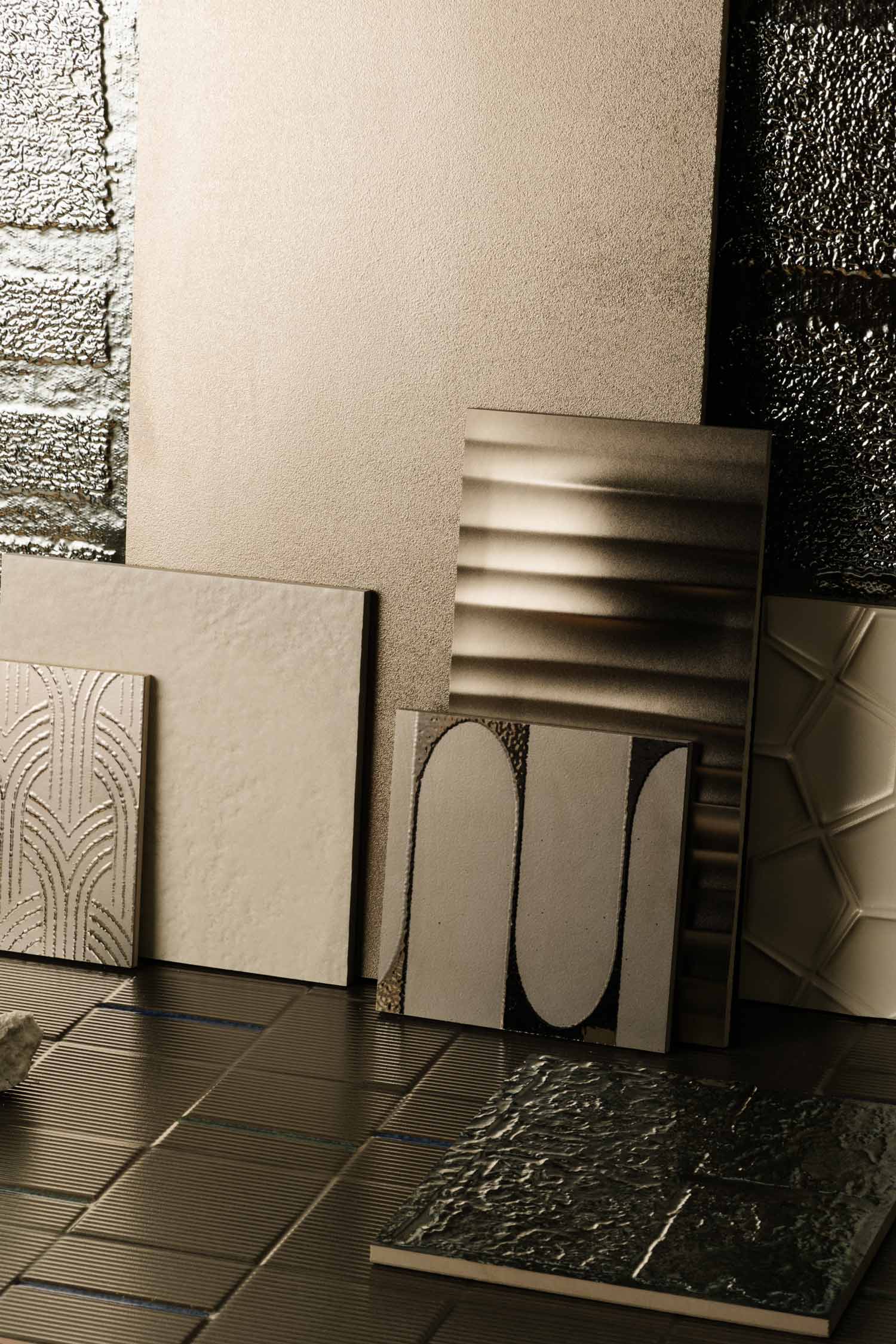 Entre los azulejos plateados para suelos encontramos algunos que nos transportan directamente a la superficie lunar, mientras que otros añaden lujo al diseño cemento gracias a sus detalles plateados. En cuanto a las baldosas de pared, la opción es mayor gracias a la variedad de diseños, relieves y acabados.