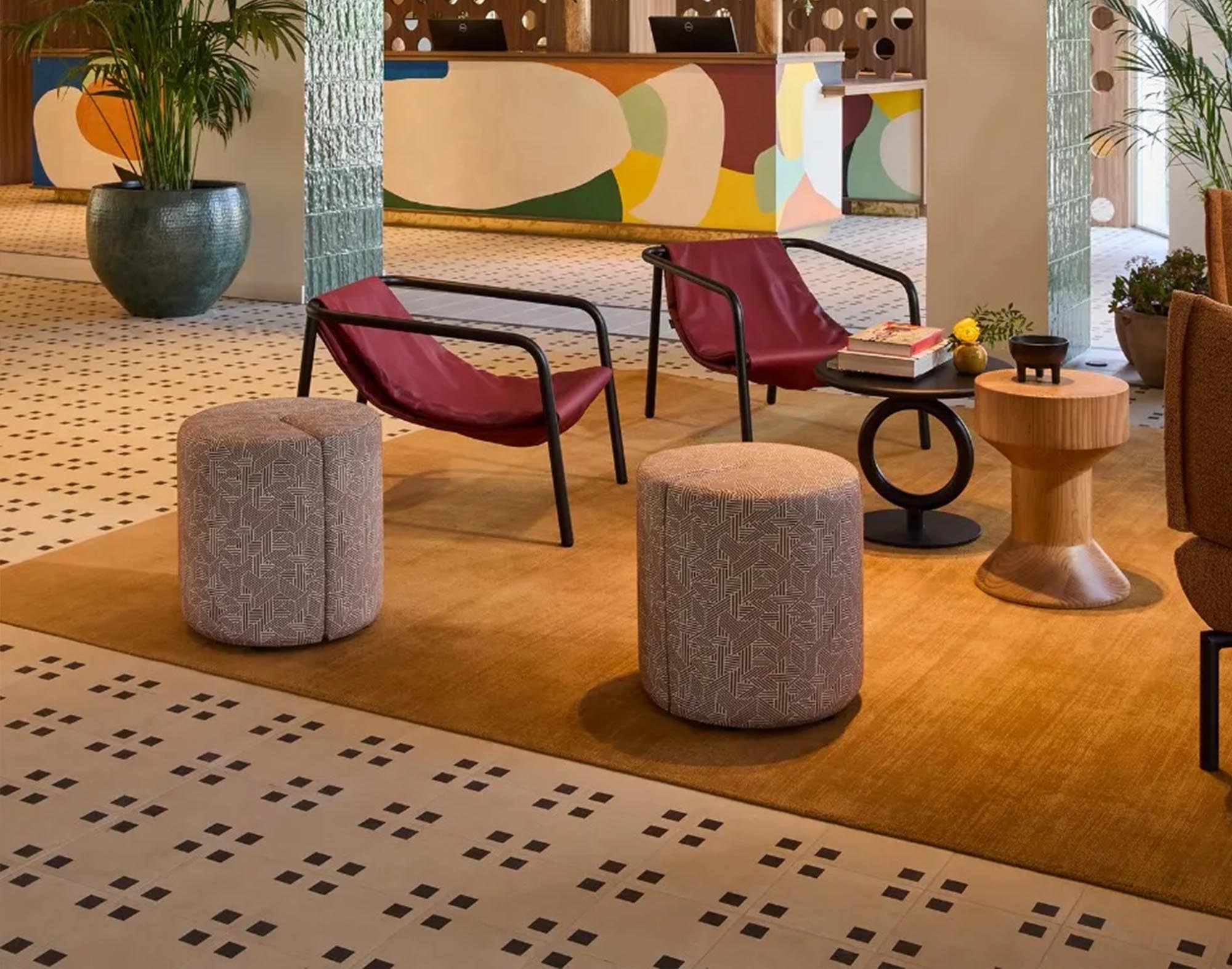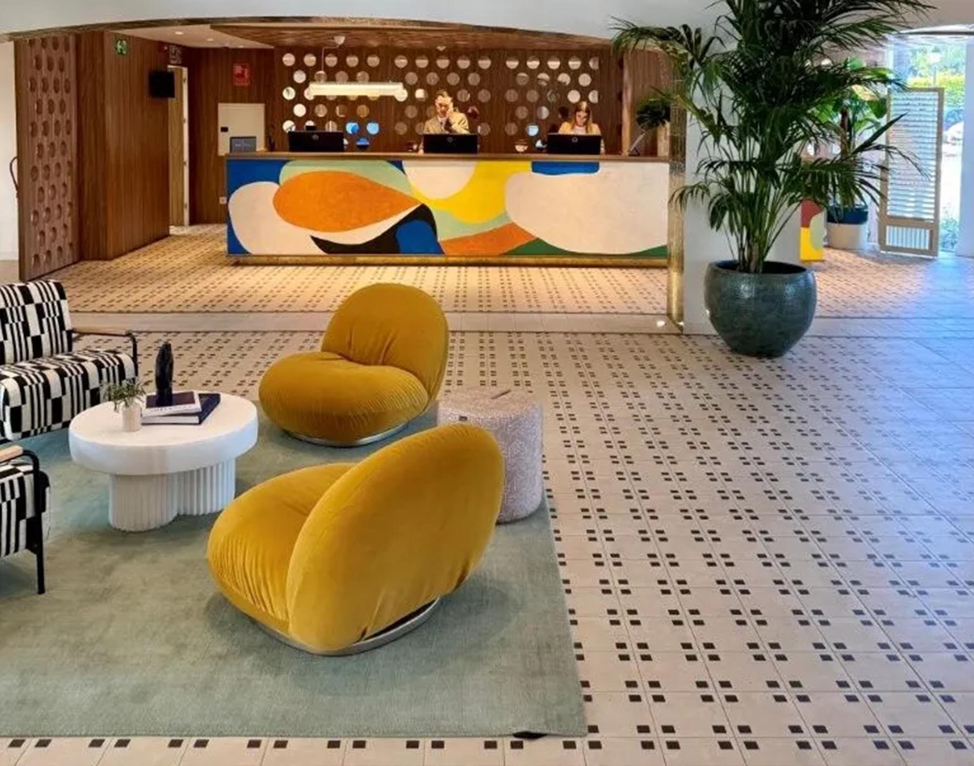 El hall del hotel, corazón de la bienvenida a los huéspedes, se convierte en un espacio donde el arte, la sofisticación y la calidez mediterránea conviven de manera armoniosa. En este contexto, nuestros azulejos Danube Otto encuentran su lugar ideal. Pertenecientes a la colección Danube, estos azulejos son una reinterpretación moderna del hidráulico clásico: sobre un fondo crema neutro, presentan motivos geométricos que aportan dinamismo y personalidad al espacio, mientras que su paleta cálida se aleja de los tonos fríos tradicionales, integrándose a la perfección con los colores pastel y terrosos que caracterizan el interior. Su formato de 60x60 cm y la variedad de seis motivos diferentes permiten crear composiciones visuales atractivas y equilibradas, que acompañan sin saturar la narrativa del diseño.