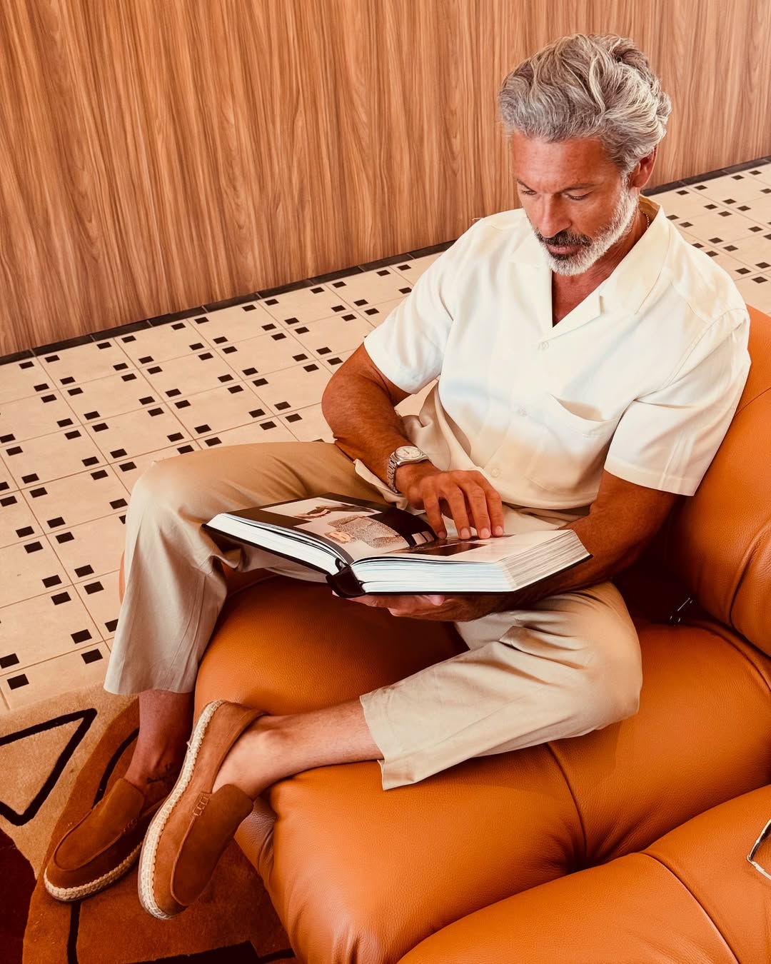Their 60×60 cm format and the combination of six designs allow for balanced compositions that blend naturally with the warm, Mediterranean palette of the project.