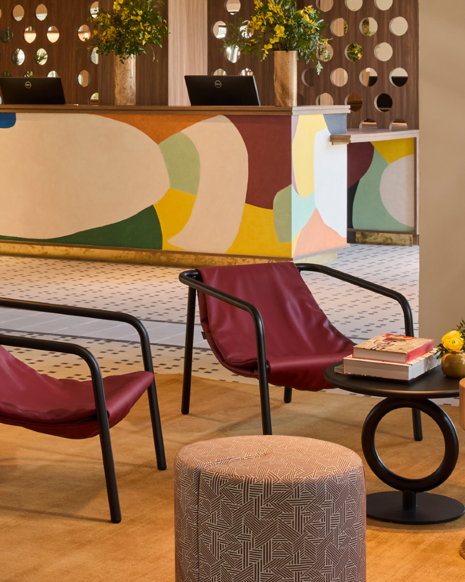 In the hotel’s lobby, the key welcoming space, our Danube Otto tiles find their perfect place. Part of the Danube collection, they offer a contemporary take on classic hydraulic tiles: set against a neutral cream base, their geometric patterns bring dynamism and character to the space.