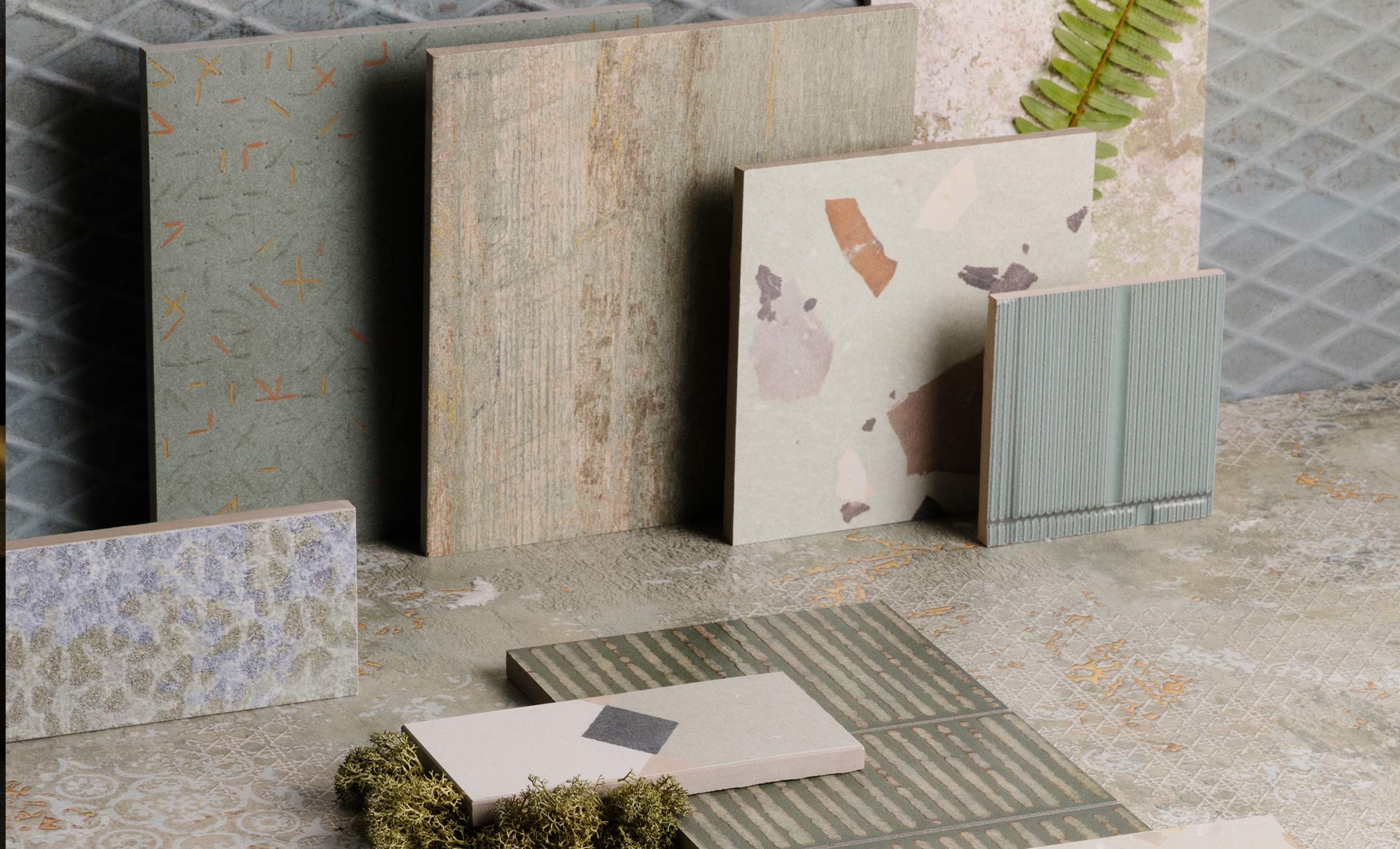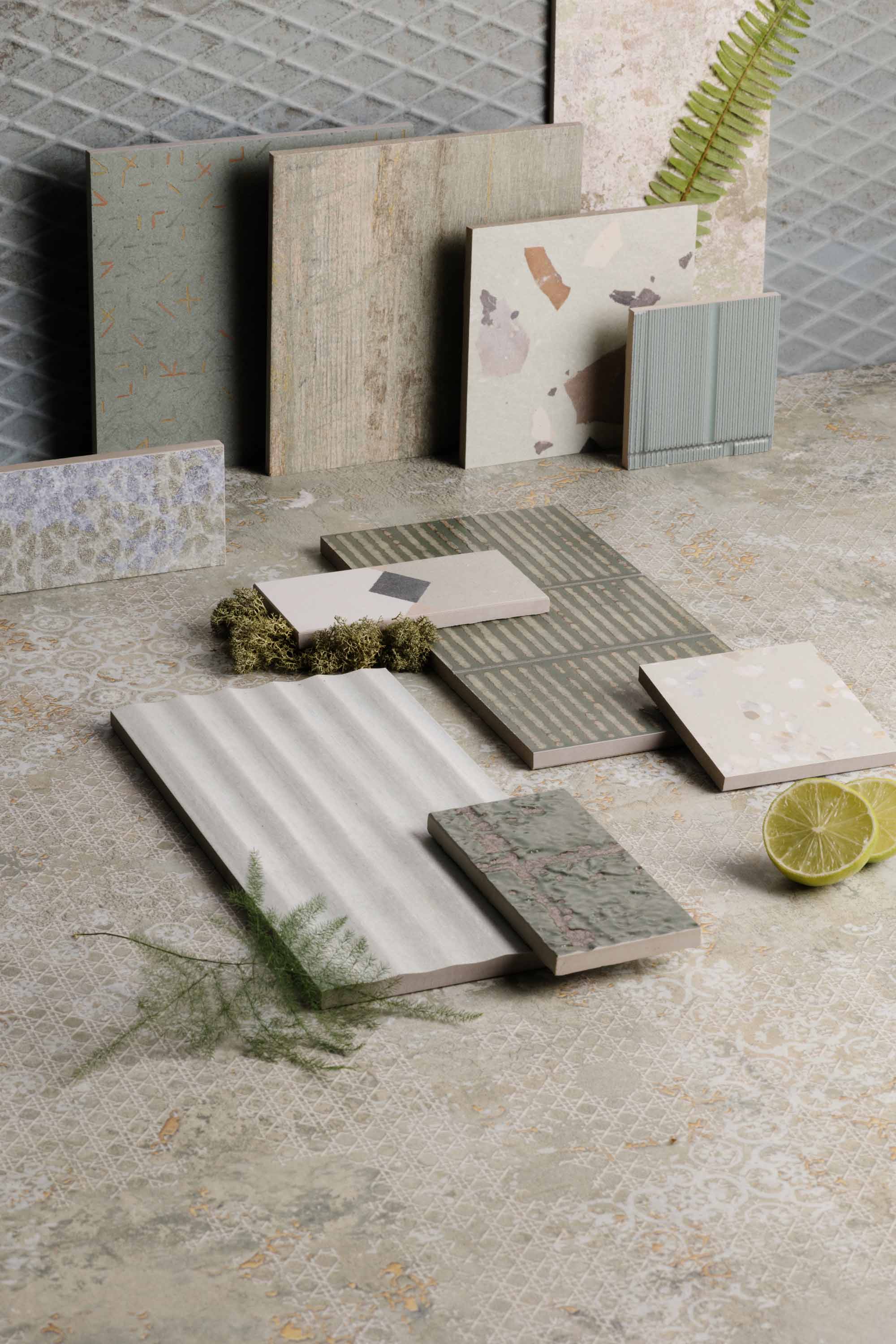 Una collezione di atmosfere che dimostra come il colore verde possa essere integrato in ogni tipo di superficie e stile grazie al gres porcellanato.